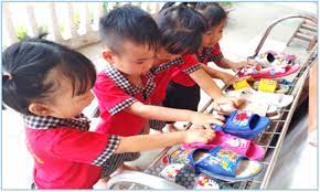 - Khi đón trẻ vào lớp nhắc trẻ phải chào bố, mẹ, ông, bà, anh, chị ; chào cô, hướng dẫn trẻ xếp mũ nón, cặp vào tủ, hướng dẫn trẻ xếp dép đúng chân ngay ngắn lên kệ dép và lấy dép đi trong lớp đúng ký hiệu của mình.