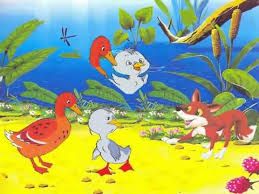 Nói rồi Cáo đi nhanh ra phía bờ ao. Khi Cáo vừa ra đến nơi thì cũng là lúc Vịt mẹ tìm thấy Vịt Xám. Trông thấy Cáo, Vịt mẹ vội dẫn Vịt Xám nhảy tùm xuống ao. Thế là Vịt Xám thoát chết.