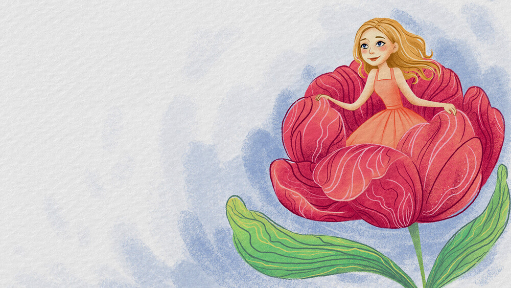 Nhưng đang lúc bà ta hôn bông hoa, bỗng có tiếng động rất mạnh làm hoa bừng nở. Rõ ràng là một bông hoa thật, nhưng ở giữa hoa có một cháu bé gái xinh đẹp ngồi trên nhụy hoa màu xanh như ngồi trên một chiếc ghế tựa, bé không lớn gì hơn ngón tay cái nên người ta gọi bé là Bé tí hon.