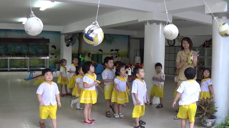 Chuẩn bị: Các em tham gia chơi chia thành nhiều đội, số người trong mỗi đội bằng nhau. Các đội đứng thành hàng dọc trên sân trường. Mỗi đội cử ra một người đứng cách đội của mình từ 5 - 10m quay mặt lại phía đồng đội tay cầm một chiếc gậy có buộc một quả bóng (khăn quàng), chiều cao thích hợp theo từng lứa tuổi để khi nhảy lên tay chạm được vào bóng hoặc khăn.