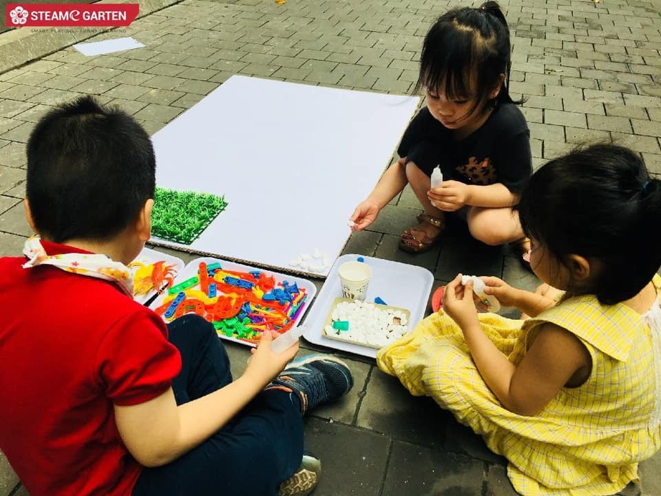 Bố mẹ hướng dẫn các bé sử dụng quả Pom pom, sỏi, cúc áo hoặc hột hạt xếp theo hình các thẻ chữ cái đã chuẩn bị sẵn.